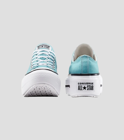 he shoe maintains the timeless silhouette of the Chuck Taylor but with a modern lift. The colorway blends soft Deja Blue with black accents, offering a stylish, versatile look. This platform sneaker is perfect for those seeking both comfort and elevated style.
