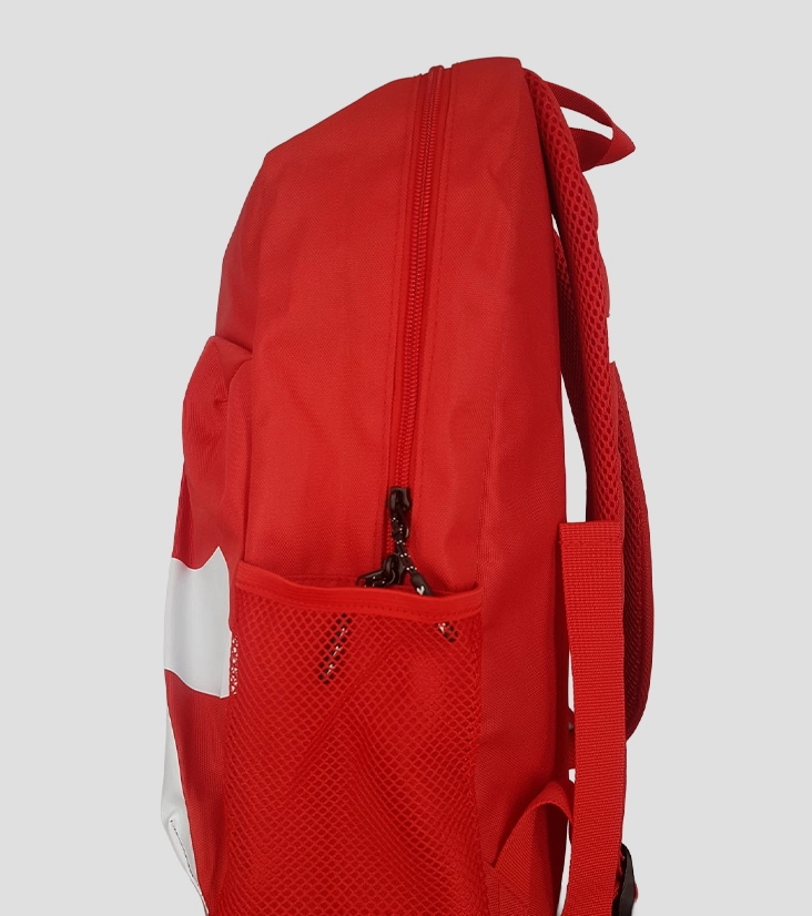 The backpack is made from durable, lightweight material and offers adjustable shoulder straps for comfortable carrying. Its vibrant red color adds a bold, sporty look.