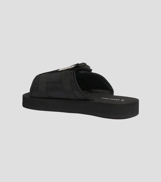 It features a sleek black design made from durable fabric with textile details. The sandal is a slip-on with an open toe, making it easy to wear and perfect for warm weather.