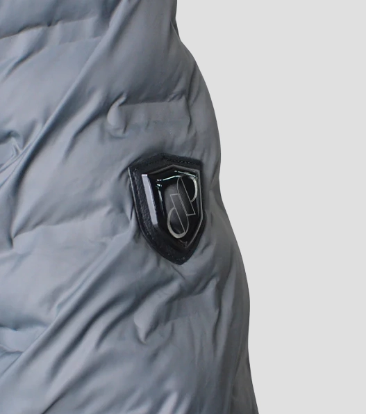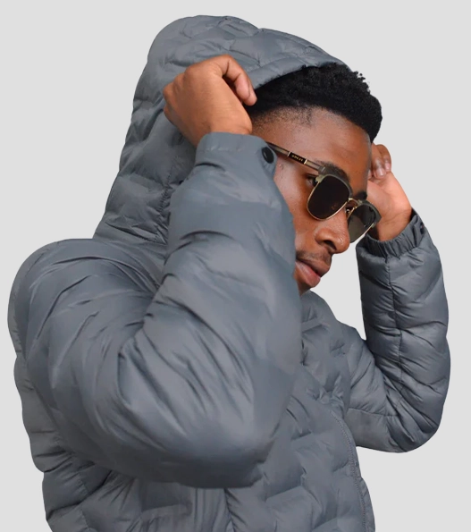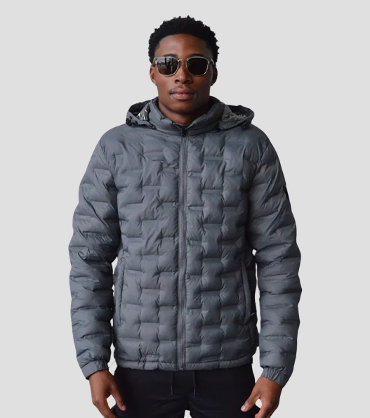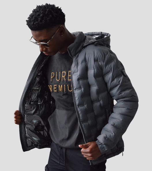 Ribbed cuffs and waistband provide warmth and secure wear. This jacket comes with multiple practical pockets and a protective hood for added convenience. Its clean lines and zip details give it a sleek look, making it perfect for layering over tees or knitwear. The combination of grey and silver colors adds a contemporary, versatile appeal to any outfit.