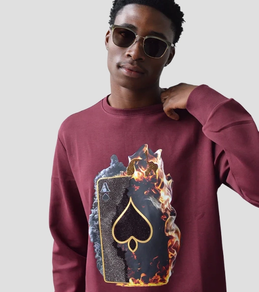 The sweater features a deep burgundy color with a bold ace card design enhanced by flames, creating a striking statement piece. Its smooth texture and structured silhouette add a modern edge while maintaining comfort.