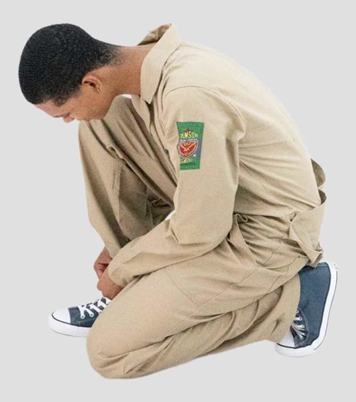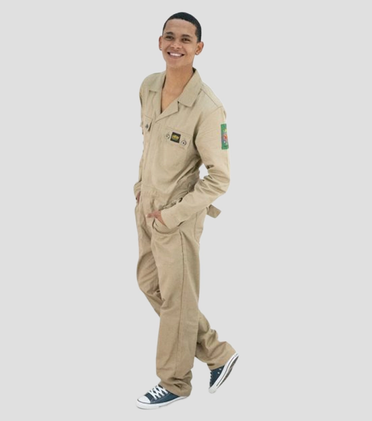 The Samson Boileruit in Khaki is made from 100% premium cotton twill, known for its durability and comfort. It features a notched collar design, long sleeves with adjustable wrist buttons, and a six-button placket neckline.